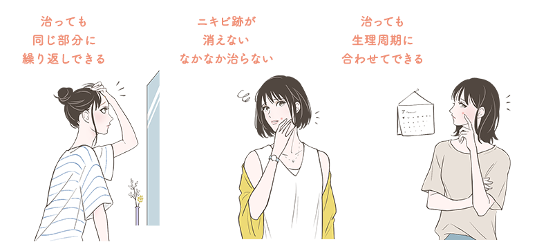 バリア機能の低下により、皮脂の過剰分泌や角層が厚くなるため、ニキビの原因になります。