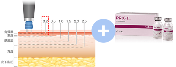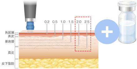 2~2.5mmの長さの針でお肌に穴を開け、高濃度グロースファクター(成長因子)を肌に浸透させることで、コラーゲン生成と肌の再生を促します。皮膚再生療法の組み合わせで、ニキビ跡、しわや毛穴の開きのお悩みにもアプローチします。