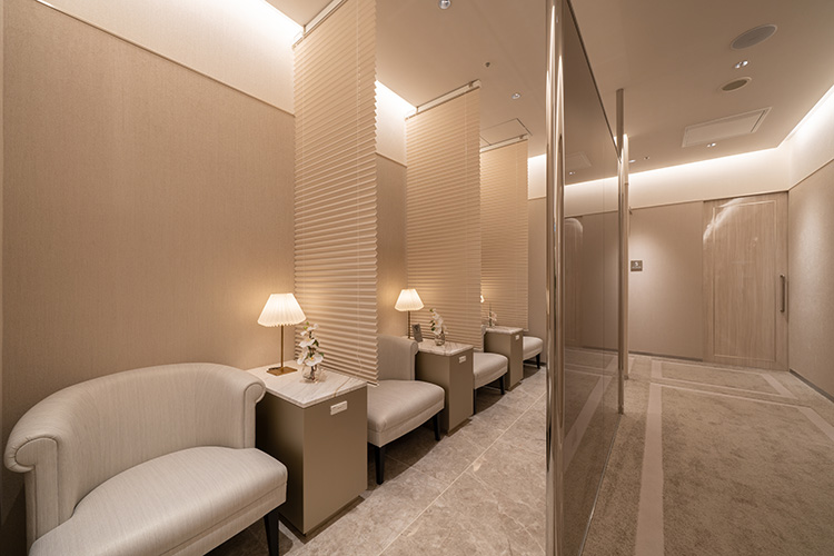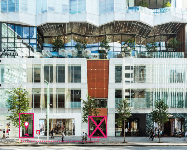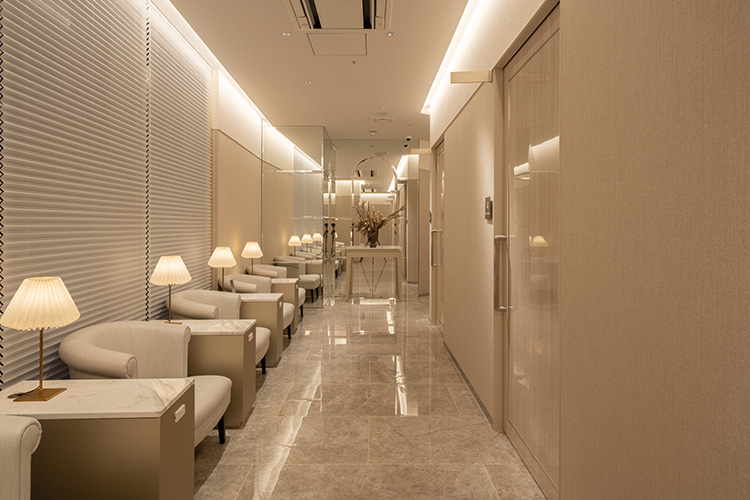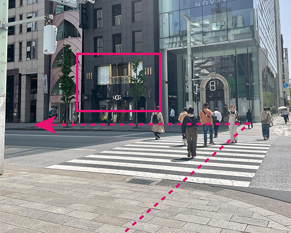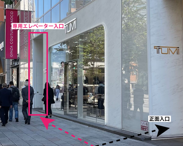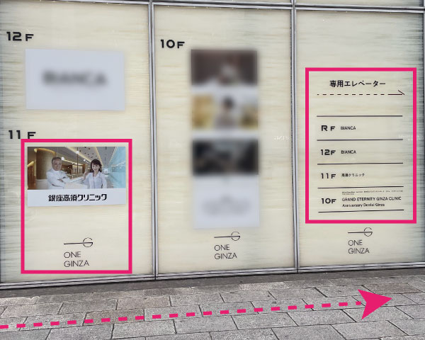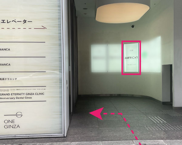 5. 左側を向くとONE GINZAの壁にご案内があります。銀座高須クリニックはこちらの専用エレベーターからお越しいただけます。