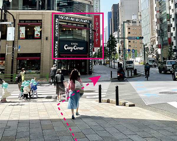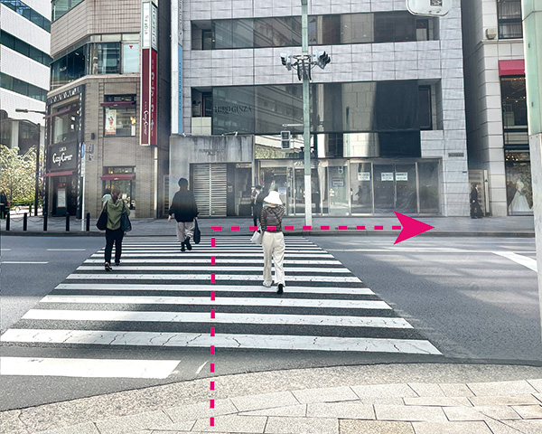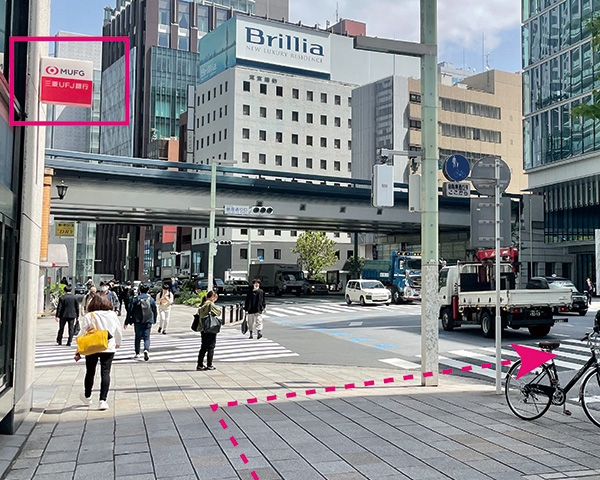 3. 少し進み三菱UFJ銀行の看板が見えたら右に曲がり横断歩道を渡ります。