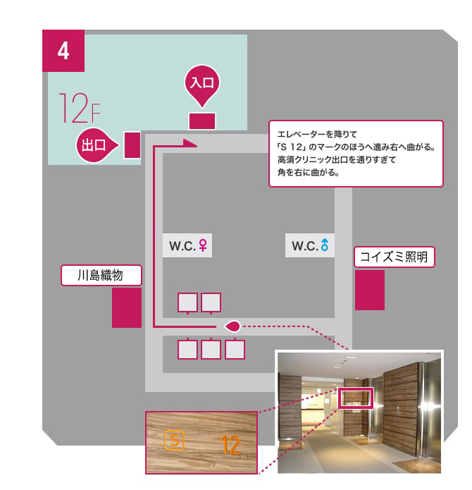 エレベーターを降りて「S 12」のマークのほうへ進み右へ曲がる。