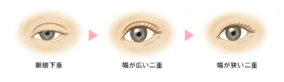 二重まぶたミニ切開法(部分切開法、小切開法)、全切開法、眼瞼下垂手術などをして幅の広い二重を作った後、幅を狭くしたいという方がときどきいらっしゃいます。