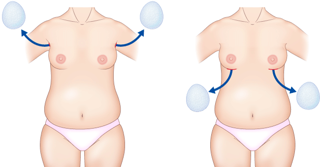 バストの脂肪注入豊胸手術は、二の腕、お腹、ウエスト、背中、お尻、太もも、ふくらはぎなどの余分な皮下脂肪を脂肪吸引し、バストに脂肪注入をします。脂肪吸引は、カニューレという3mm程度の細い管を挿入して皮下脂肪を吸引する手術であるため、吸引する部位の皮膚に何ヵ所か数mm程度の小さい切開をします。
