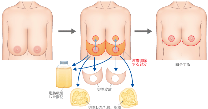 バストを小さくするために、皮膚を切除する前に脂肪吸引をしたり、皮膚を切除するときに同時に乳腺や脂肪を切除します。