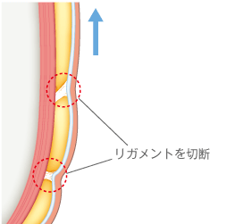 強固なリガメントを利用するリガメント法では、皮膚を骨に固定しているリガメントをはずし、そのリガメントをリフトのアンカーとすることで、広範囲の皮膚を引き上げられます。