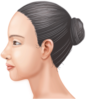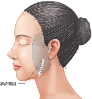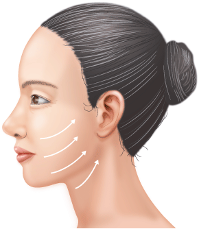 耳の前から髪の生え際の目立たない部分を切開し、頬とフェイスラインのたるみを引き上げます。