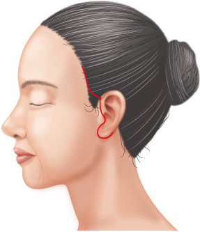 手術は、切開部分から皮膚を後ろに引っ張ってしわとたるみを伸ばし、結合させる部分を丁寧に縫い縮めた後、残った皮膚を切り取って縫合します。ほとんどの傷跡は髪の毛に隠れ、耳の前の切開部も耳との境目に同化するので、時間の経過とともに気にならなくなっていきます。