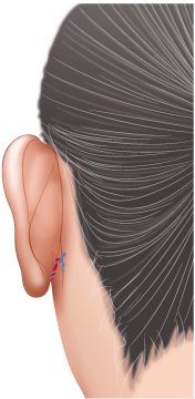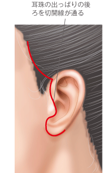 こめかみの有髪部(髪の毛の生えている部分)から耳の前、耳たぶの後ろにかけて皮膚を切開します。
