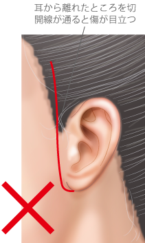 よく耳介から離れた部分を切開する方法がありますが、その場合は傷跡が非常に目立ってしまうのでよろしくない。