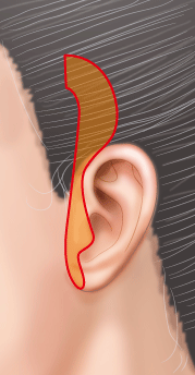 耳の前の切開は、耳介の輪郭に沿って切開し、耳珠の前を切開するのではなく、耳珠の出っぱりの後ろを切開するので、傷跡は目立たなくなる。