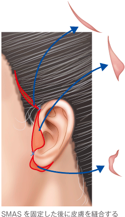 こめかみの有髪部(髪の毛が生えている部分)から耳の前、耳たぶの後ろにかけて皮膚を切開し、頬のSMAS(スマス)という筋膜組織と首の筋肉である広頸筋(プラティスマ)を引き上げ固定し、余分な皮膚を切除する手術です。