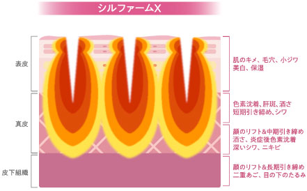 しかし、シルファームXでは、メラノサイトのある「基底膜」や赤ら顔の原因になる毛細血管のある真皮層へもダイレクトにエネルギーを届けることができます。これまで難しかった肝斑や赤ら顔の根本改善を可能にしたのが、シルファーム Xです。