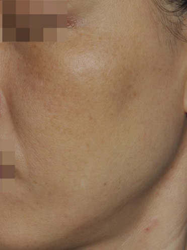 1回施術後。頬骨のいちばん高いところを中心に目立っていた肝斑が、かなり改善されているのがわかります。シルファームXはコラーゲン生成効果と創傷治癒作用による表皮の再生効果も備えているため、肝斑治療と同時にハリやなめらかさなどの美肌効果も得られます。