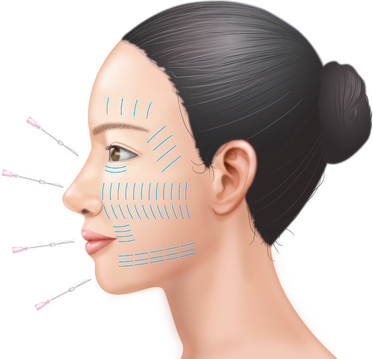 極細の針を使用し、痛みもほとんどなく、ダウンタイム等の心配がいらないことや施術後すぐにメイクをしてお帰りいただける手軽さから、ショッピングスレッド、リードファインリフトと呼ばれ、施術後約1年弱の効果が期待できます。