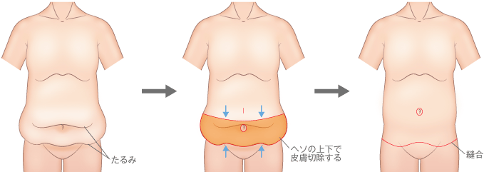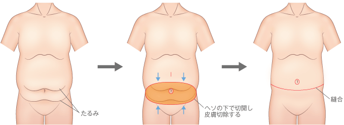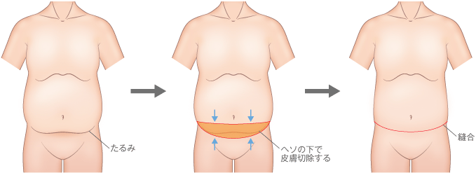 お腹のたるみ取り手術は、お腹周りの余分な皮膚を切除し、縫合します。