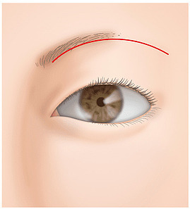 切開するラインがずれてしまうと、傷跡が目立ってしまう可能性がありますが、正しいデザインで正しい手術を行い、丁寧に縫合した場合、眉毛に隠れるため、傷跡が目立つことはほとんどありません。