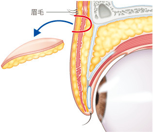 まゆ毛のすぐ下にある厚いまぶたの皮膚だけを切除し、下の薄い皮膚は残して縫い縮めるため、目のラインやまぶたをすっきりさせることができます。