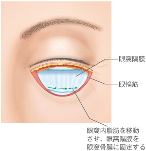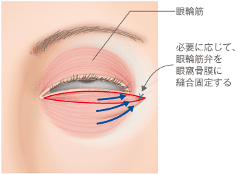 必要に応じて眼輪筋弁を作成し、吸収糸(溶ける糸)で眼窩骨膜に縫合固定し、たるみの再発を防ぎます。