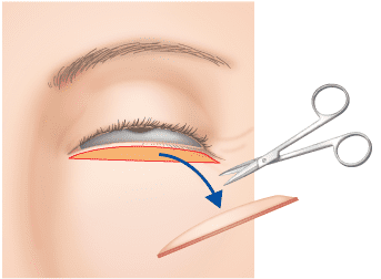 目頭側から目尻側まで切開し、余分な皮膚と、余っている脂肪を切除します。