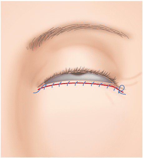 手術では、下のまつ毛の生え際でたるみを切除して縫合します。