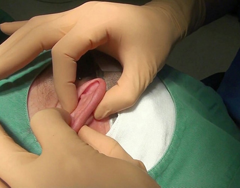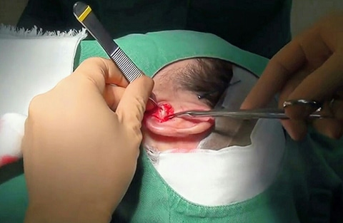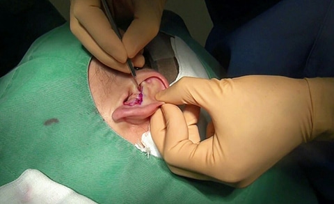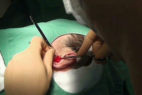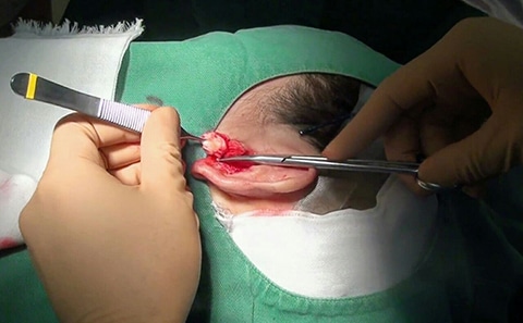 局所麻酔がよく効いたら、メスでデザイン通りに皮膚切開します。
