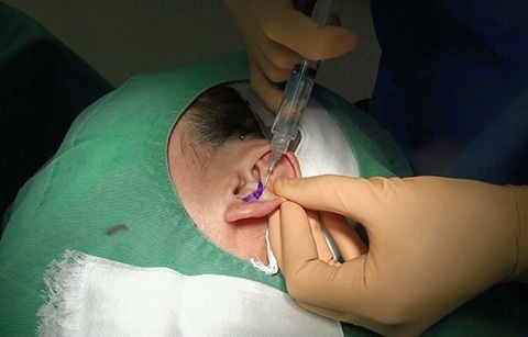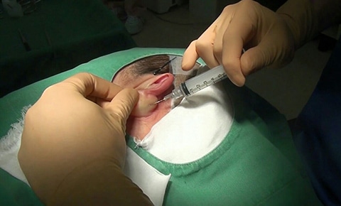 器質化軟骨と皮膚を剥がすように、皮下を膨らませながら局所麻酔液を注入します。