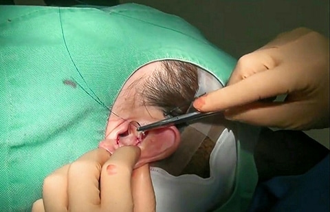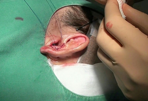 最後に枕固定をするために、4-0ナイロン糸で耳介を貫通させます。