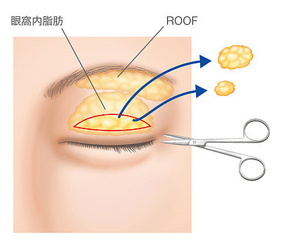 オプションとして眼窩内脂肪の除去を行うクリニックもありますが、まぶたの厚みの主な原因は皮下脂肪とルーフであるため、効果は限定的なことが多いです。